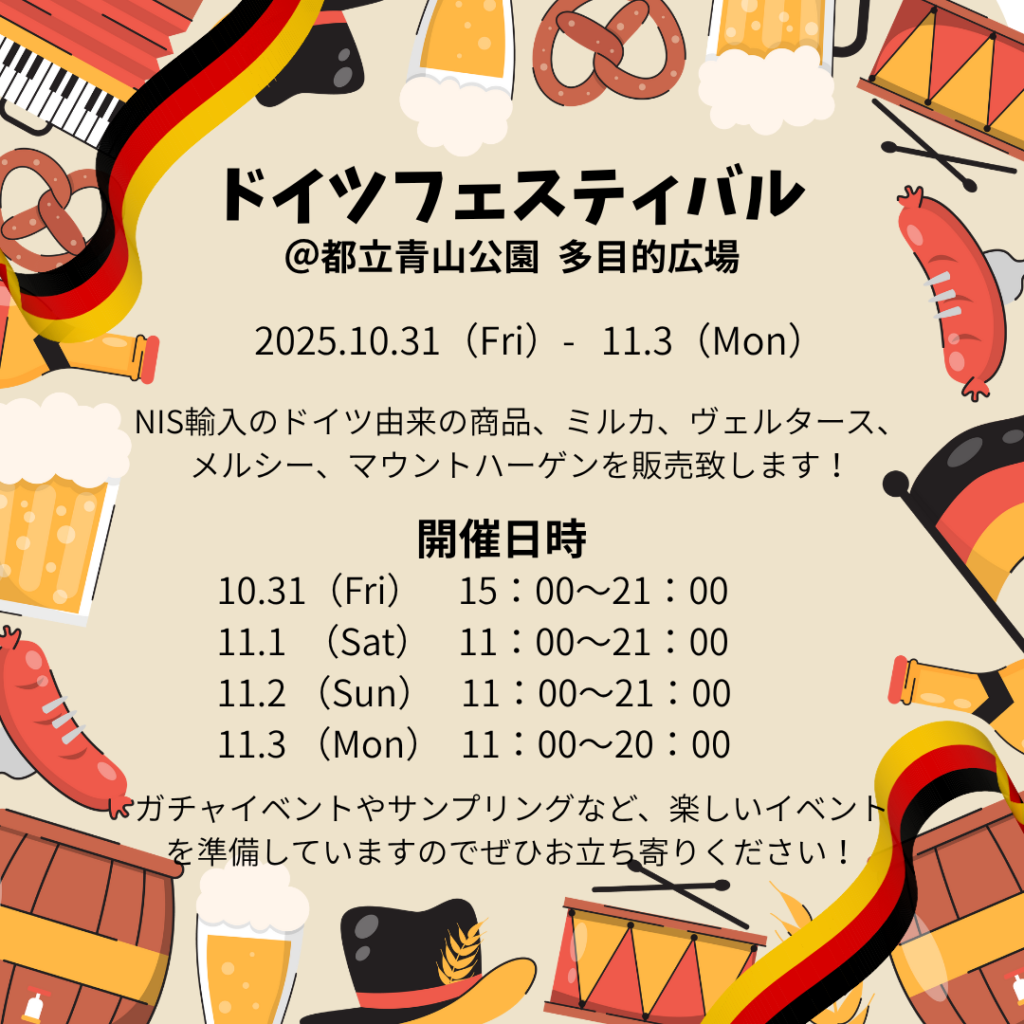 エヌアイエスフーズサービス株式会社(本社:東京都品川区、代表取締役社長:鵜飼 克則)は、2025年10月31日(金)~11月3日(月・祝)に都立青山公園で行われるドイツフェスティバルに出展いたします。