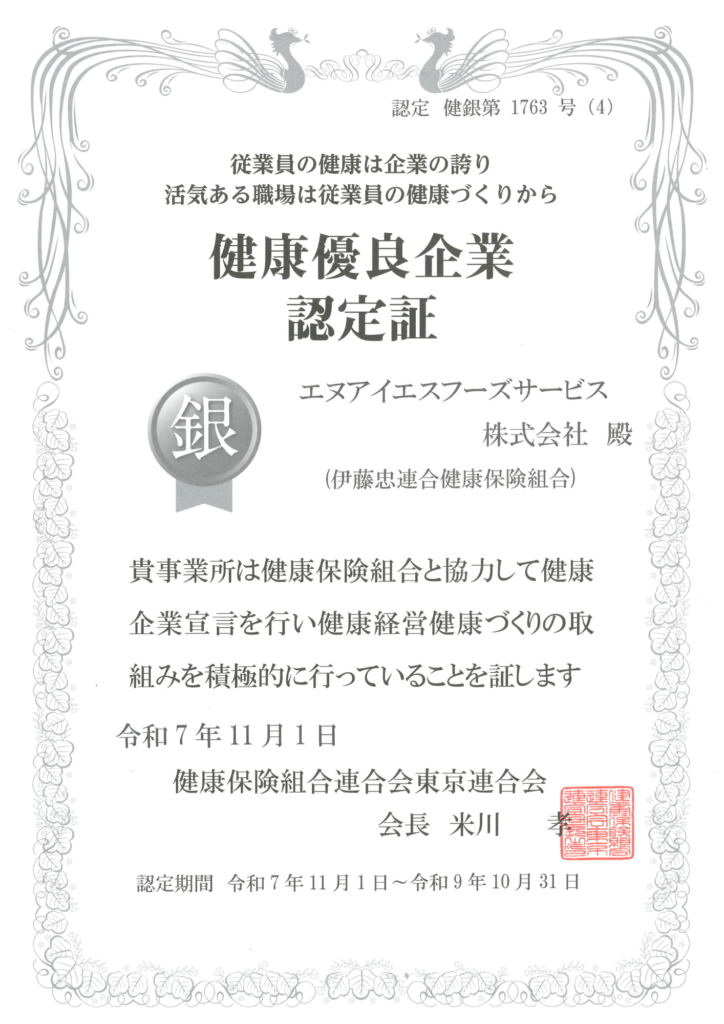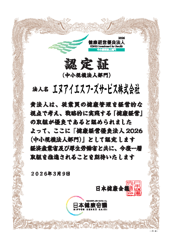 輸入食品、輸入菓子のブランド商品を販売するエヌアイエスフーズサービス株式会社(本社:東京都品川区、代表取締役社長:鵜飼 勝則)は、2026年3月9日、経済産業省と日本健康会議が共同で選出する「健康経営優良法人2026 中小規模法人部門」に認定されました。